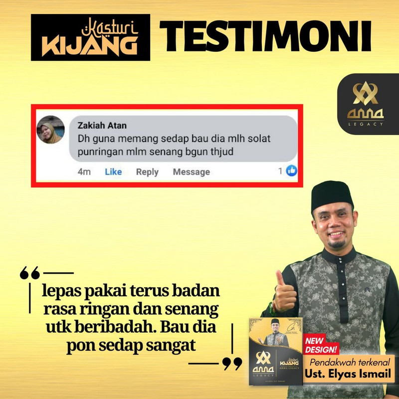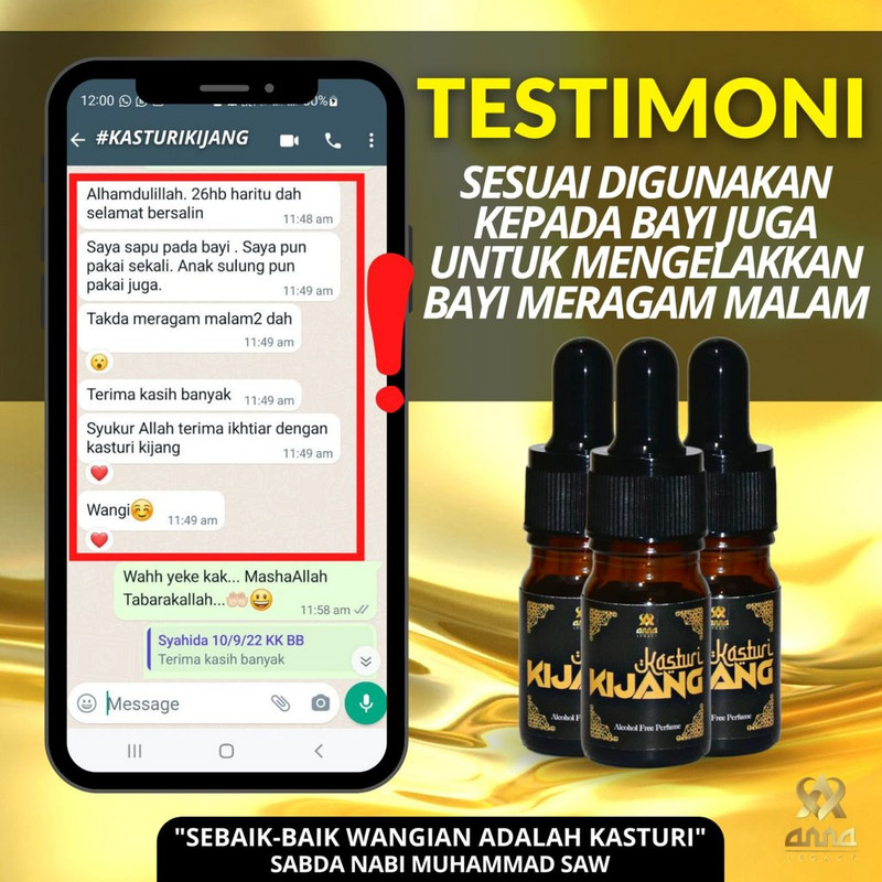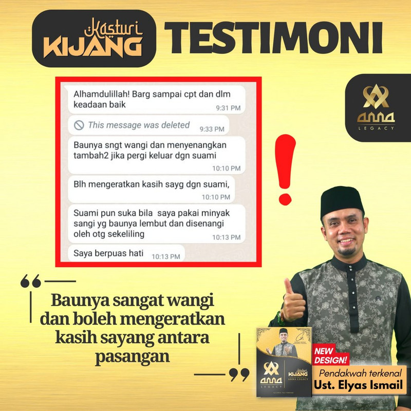 Kasturi adalah Wangian yang dicintai Rasulullah s.a.w. Hadir dengan ketenangan & keselesaan dengan hanya satu calitan Wangian Anna Legacy, Kasturi Kijang ❤️